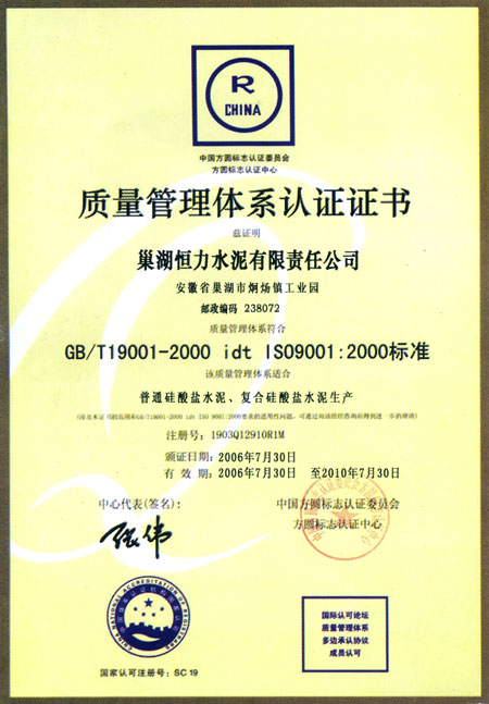 質(zhì)量管理體系認(rèn)證證書